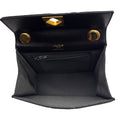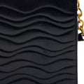 This small, rare Lalique wavy flap bag is crafted from smooth black leather featuring a unique horizontal wavy quilted pattern. It is highlighted by a crystal inset in its gold-tone clasp, beautifully merging fine leatherwork with Lalique's legendary glass artistry. Equipped with both a sleek top handle and an elegant gold-tone chain and leather strap, this lovely bag transitions effortlessly from a sophisticated day look to a refined evening accessory.
